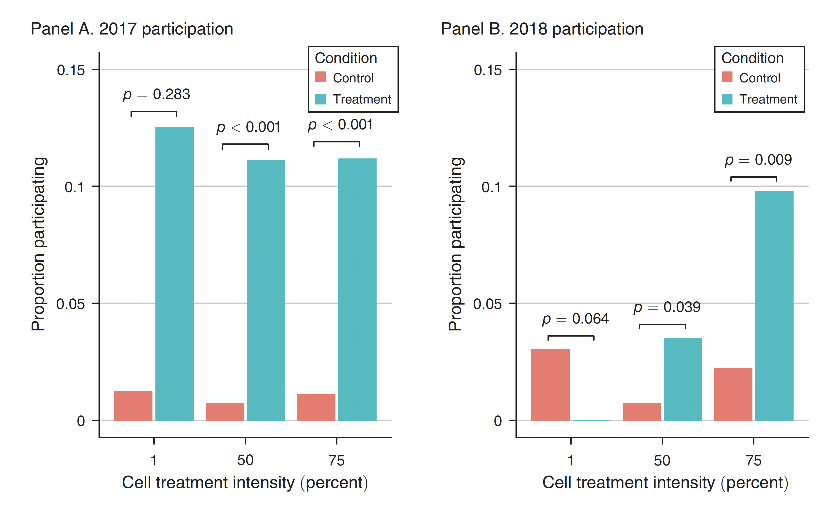 The chart below shows the proportion of students in the study who participated in the 2017 and 2018 July 1st protests by what percent of their major cohort was nudged to go.