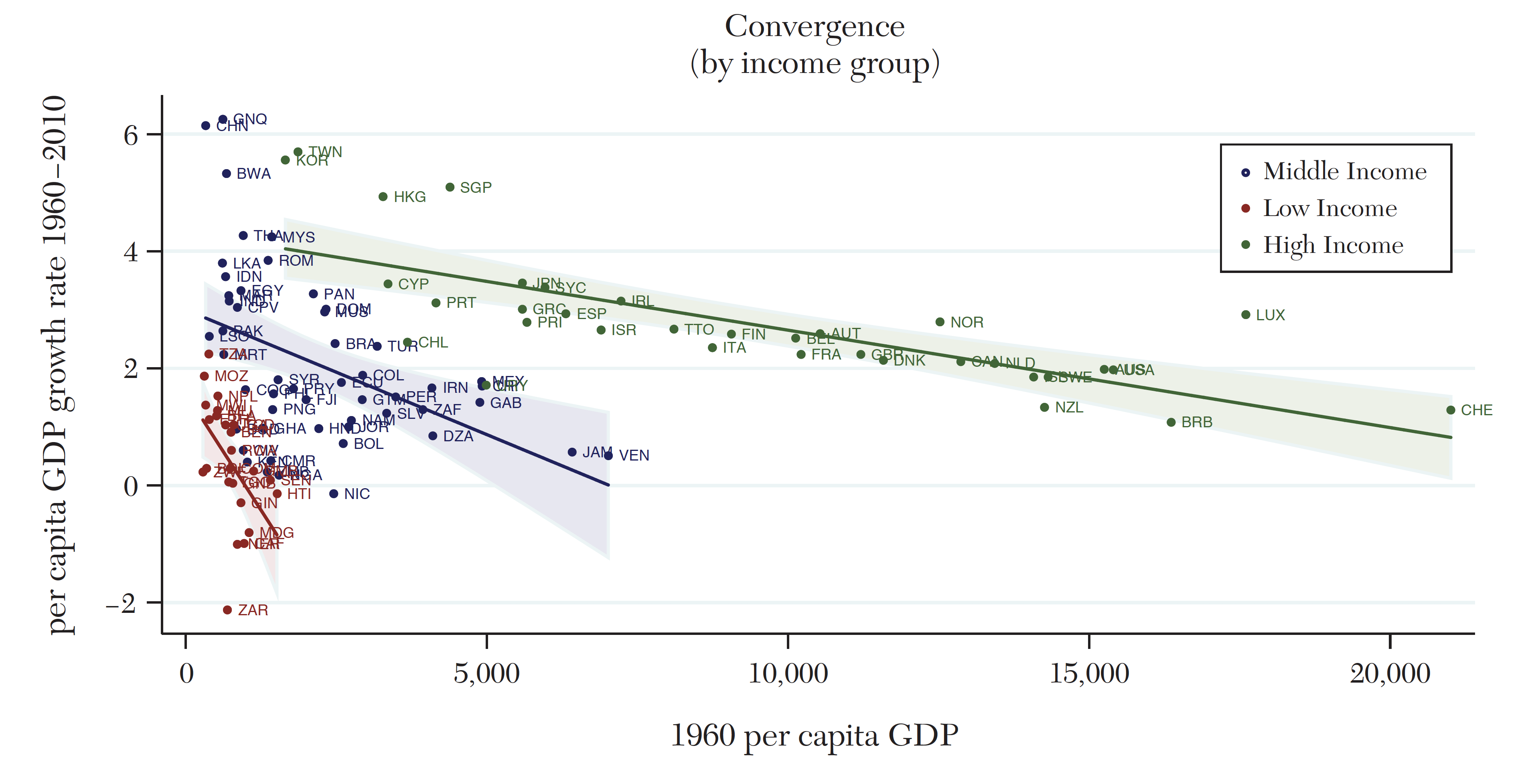 The chart below shows how a country's income (GDP per capita) in 1960 relates to its growth in income from 1960 to 2010. The downward slope in each of the lines of best fit shows the tendency for the poorest countries in an income group to catch up with the rest of their club members.