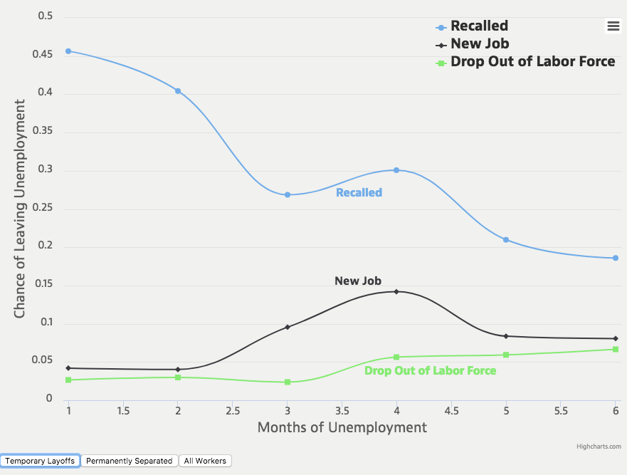 Each graph represents the chance of leaving unemployment for three groups of people: those who are on temporary layoffs, those who are permanently separated, and all workers. Click the buttons below to switch among these groups.