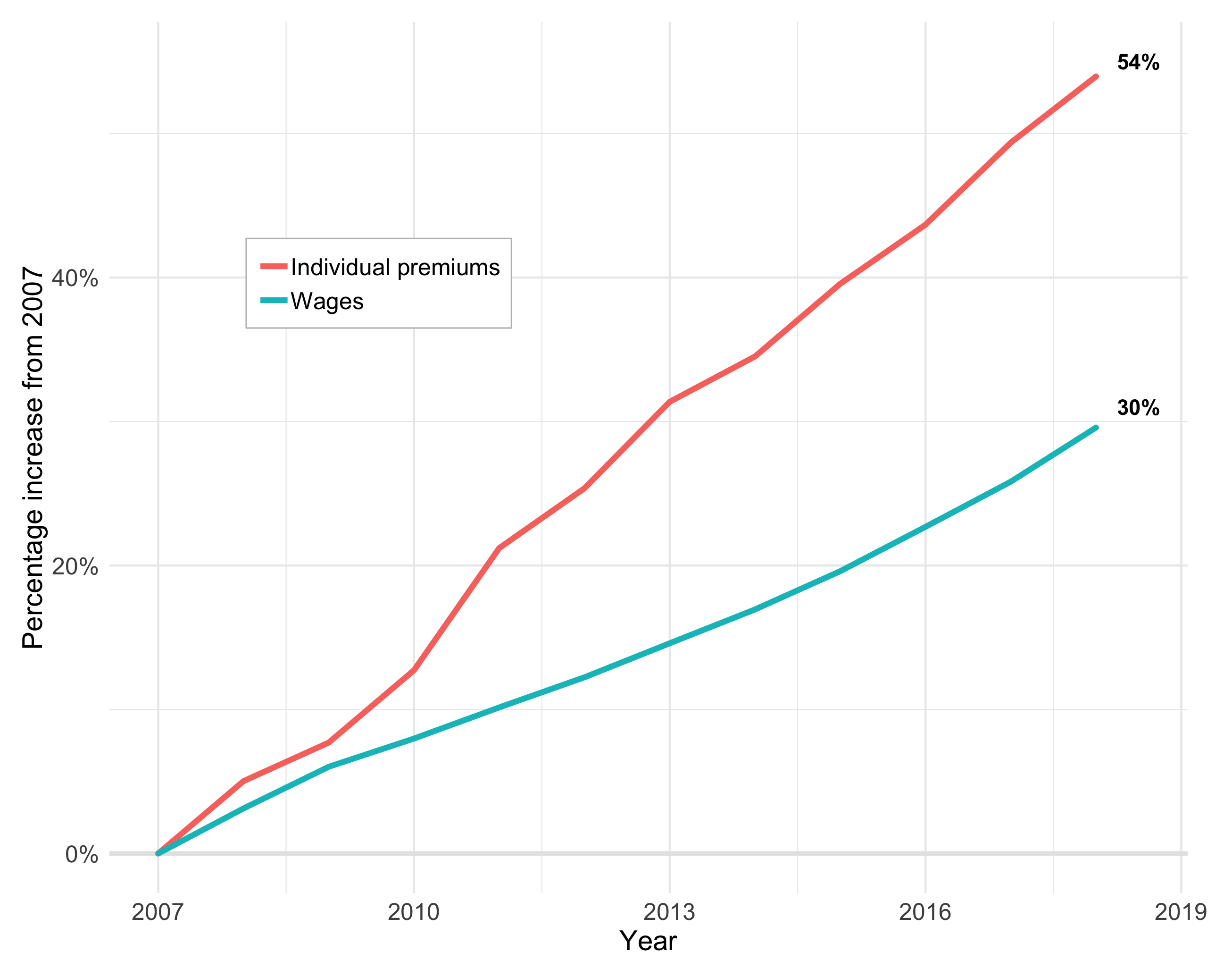 US health insurance premiums have continued to grow faster than wages. The chart below shows the percentage increase in individual premiums and average earnings since 2007.