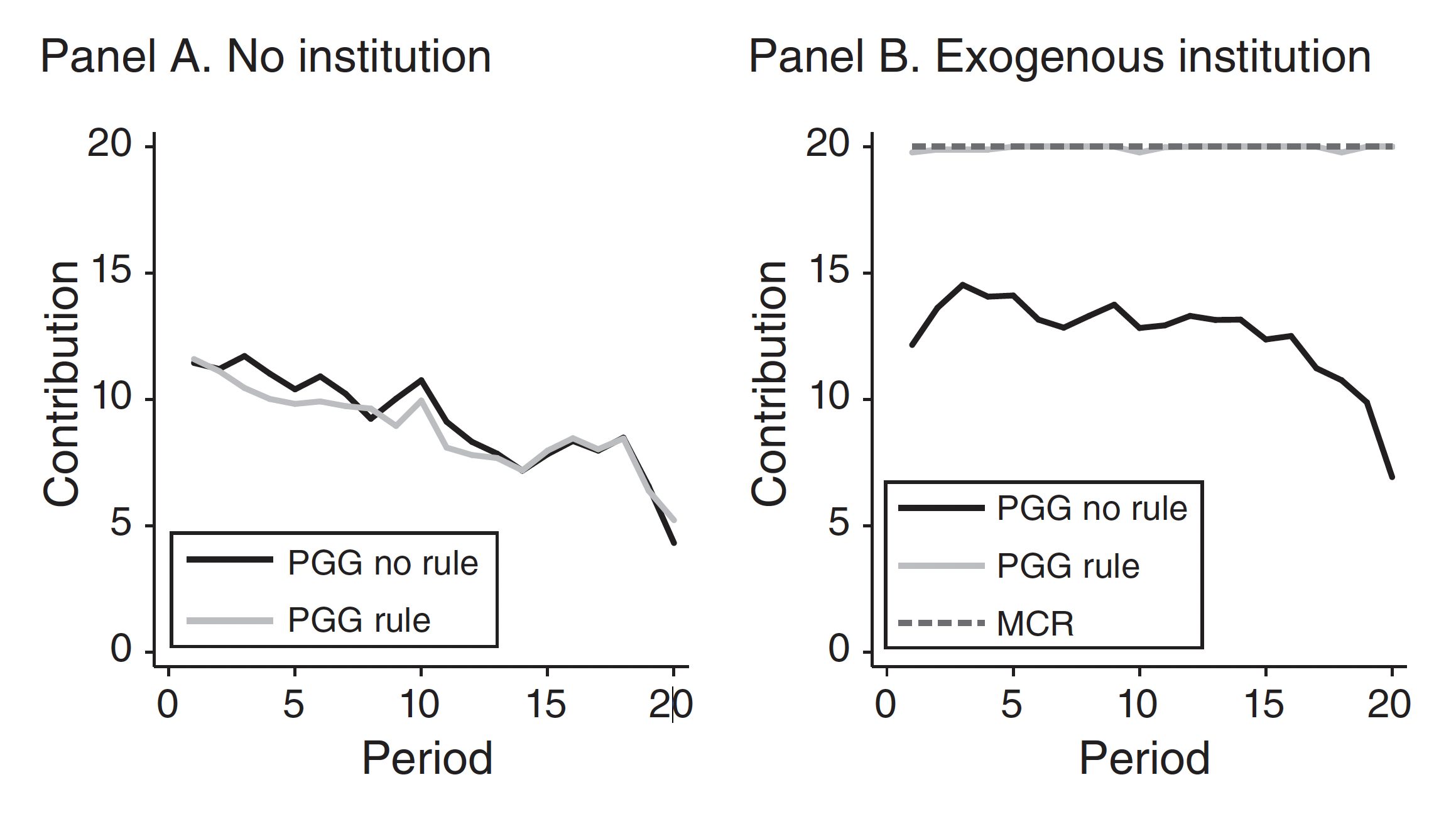 The chart below shows the average points contributed in each public goods game (PGG) played over 20 periods. Panel A shows the contributions from participants that didn't play under an institution in either simultaneous game, and Panel B shows the contribution from participants that played one game under an institution (rule) and one game with out an institution (no rule). The institution enforced a minimum-contribution requirement (MCR), which was set by the researchers at 20 points.