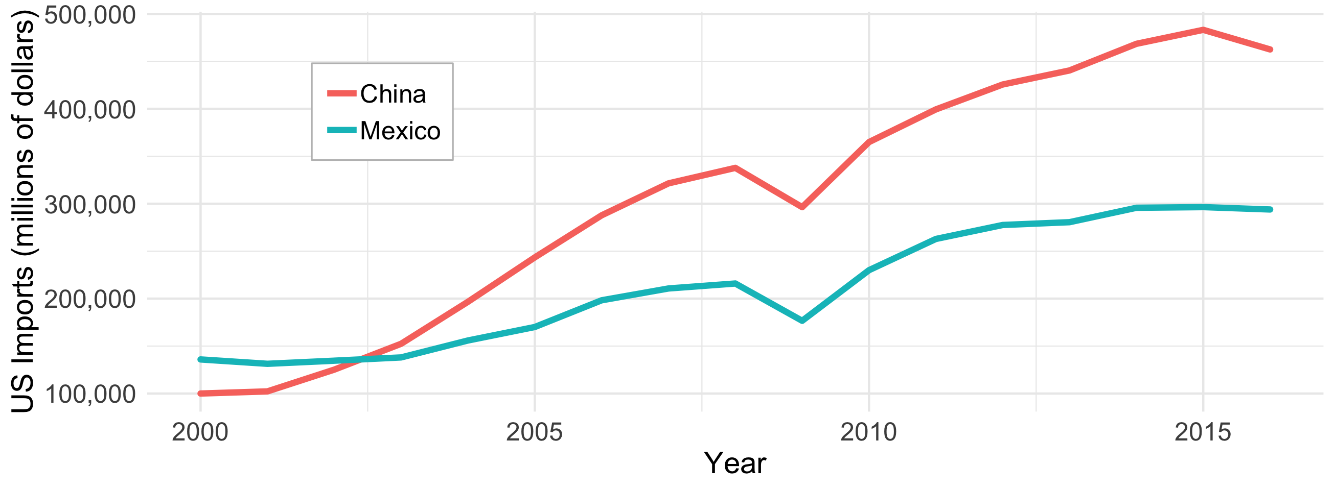 In particular, China’s growth into a major exporter of low-skilled manufacturing goods had a major impact on Mexico’s manufacturers, the authors said. Both countries in the 2000s were competing in US markets, but China’s manufacturing strength eventually forced many Mexican firms to lay off workers.