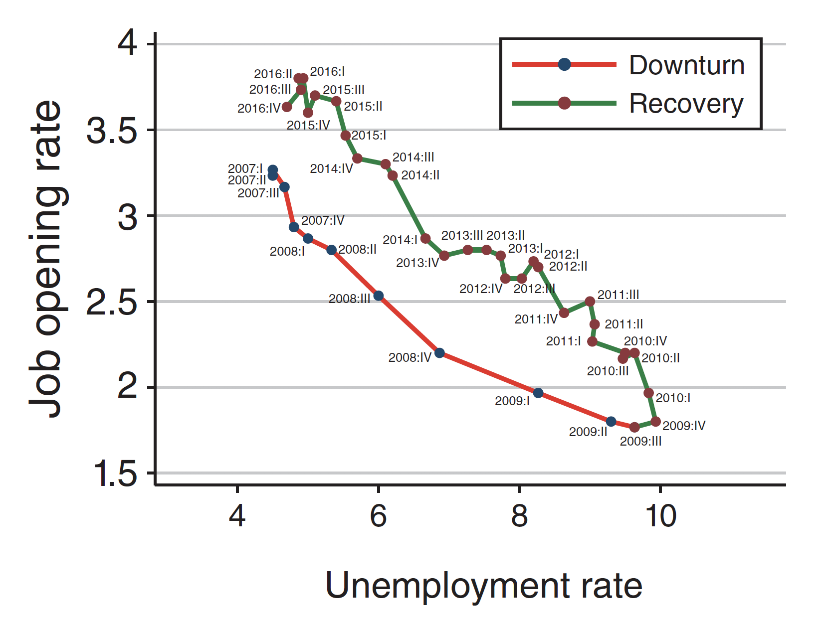 On top of accounting for unemployment swings and delayed recoveries for the unemployed, their framework also solves a puzzle that has been difficult to fit into standard models: the outward shift in the Beveridge curve during recoveries.