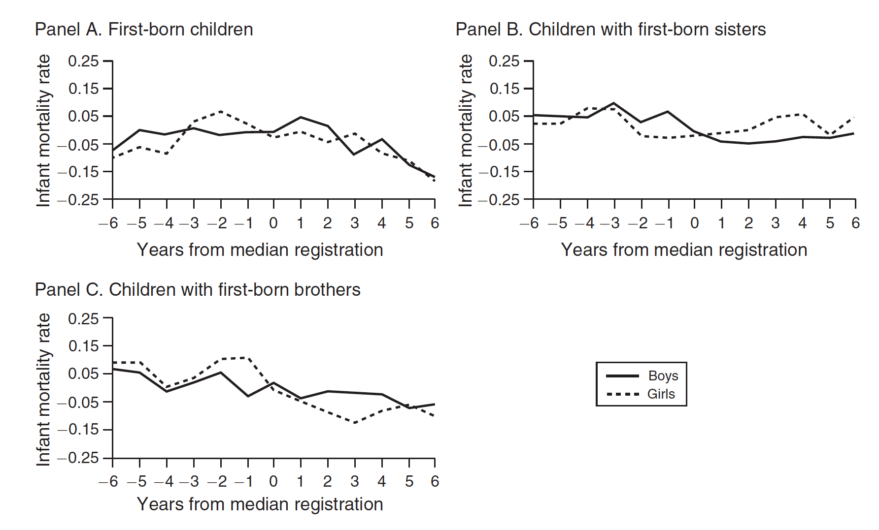 The chart below shows the infant mortality rates before and after areas reached median levels of reform. Mortality rates for firstborn children and children with firstborn brothers decreased for both boys and girls. However, mortality rates for girls and boys with firstborn sisters diverged.